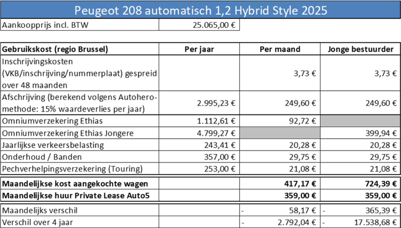 In september jongstleden heeft Auto5 zich op de markt van private lease begeven. Auto5 heeft de maandelijkse kost van de aankoop van een nieuwe Peugeot 208 vergeleken met de formule private lease.