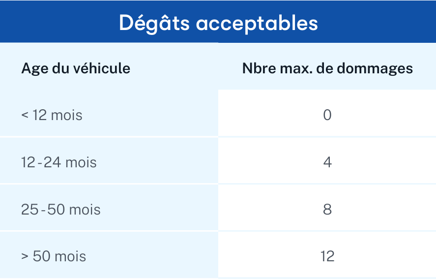 La Norme Renta 2026 a supprimé de la notion de nombre de dommages acceptables par panneau de carrosserie en fonction de l’âge et du kilométrage. Ceci a été remplacé par un nombre maximum de dommages acceptables par véhicule (voir tableau ci-dessous) en fonction de son âge.
